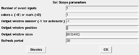 The number of graphic window used for the display. It is often good to use high values to avoid conflict with palettes and Super Block windows. If you have more than one scope, make sure they don't have the same window numbers (unless superposition of the curves is desired). Output window position : a 2 vector specifying the coordinates of the upper left corner of the graphic window. Answer [] for default window position.