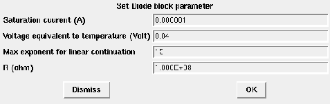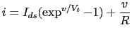 This component consists of a simple diode parallel with an ohmic resistance (). The current passing through this component is defined as a function of the voltage across the ports, ,