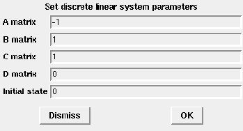 This block realizes a discrete-time linear state-space system. The system is defined by the matrices and the initial state . The dimensions must be compatible. At the arrival of an input event on the unique input event port, the state is updated.