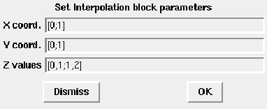 The output of this block is a function of the inputs obtained by bilinear interpolation. This block has two scalar inputs and a single scalar output. The and give respectively the coordinate and the coordinate of the -th data point to be interpolated and its value.