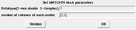 The MATCATH Block outputs the horizontal concatenation of multiple matrices. It is also called concatenation according to the columns. The inputs U1,U2,...,Un must have the same number of rows. The output is a M-by-(N1+N2+...+Nn) matrix, where N1,N2,...,Nn are the numbers of columns of the inputs matrices, and M is the number of rows.