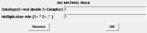 The MATMUL block computes the matrix multiplication of two inputs matrices.The number of rows of the second matrix must be equal to the number of columns of the first matrix. The output is a matrix where the number of rows is equal to that of the first input matrix and the number of columns is equal to that of the second input matrix.