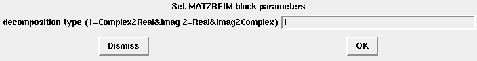 This block decomposes a complex number by separating the real and imaginary parts or compose a complex number by joining the two parts. The user can select even to separate or to join real and imaginary part by setting the decomposition type to 1 or 2. When it is set to 1, the input is a complex matrix and the outputs are the real and imaginary parts of the input. When it set to 2, The inputs are two real matrices, the output is a complex number with real part the first input and imaginary part the second input.