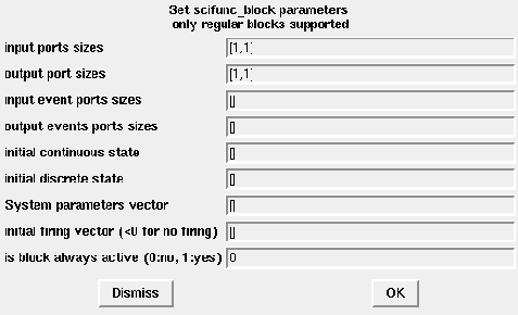 This block can realize any type of Scicos block. The function of the block is defined interactively using dialogue boxes and in Scilab language. During simulation, these instructions are interpreted by Scilab; the simulation of diagrams that include these types of blocks is slower. For more information see Scicos reference manual.