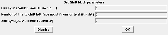 This block shifts the bits of the input signal. In this operation the digits are moved to the right or to the left. The user can choose the rule to shifts the bits. It can be normal or cycle by setting the "Shifttype" parameter to "0" or "1".